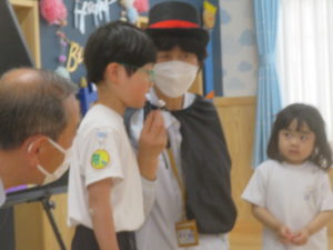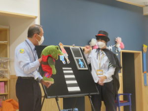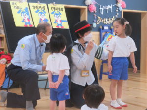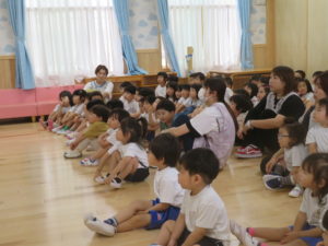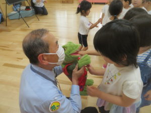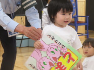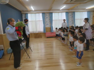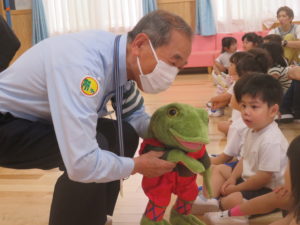 令和5年6月12日(月)ぞうさんクラブの指導員さんによる、交通安全教室に参加しました。はじめにぞうさんクラブの歌を指導員さんと一緒に歌いました。みんなすぐに覚えて大きな声で歌うことができました。それから、指導員さんがお友達のカエルくんを連れてきてくれ、カエルくんのお話しを聞いたり、マントを覆ったシルエットマンが交通ルールのクイズを出してくれ、正解すると、とても嬉しそうでした。今日は第一回目の交通安全教室。みんなで交通ルールについて、楽しく学ぶことができました。