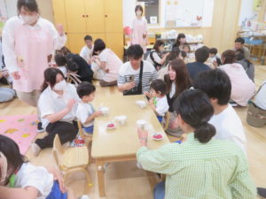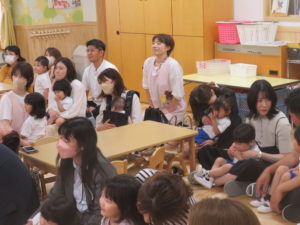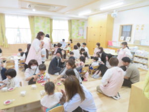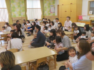 令和5年6月14日(水)は、もも0・1組、翌日15日(木)はもも2組の保育参観・懇談会がありました。ホールでは、各クラスの一日の様子をスライドでご覧いただきました。そのあとは、担任の先生と保護者の方で懇談会を行いました。ご家庭でのかわいい様子をエピソードをまじえてお話しいただき、心がほっこりする時間となりました。お部屋に戻ると、お昼寝からおきた子ども達とご対面。お家の方をみて、とても嬉しそうでみんなニコニコでしたね。おやつの様子を参観していただいたり、先生に名前を呼ばれると上手にお返事することができ、拍手でほめられると嬉しそうに照れている姿がとてもかわいらしかったです。保護者の皆様、短い時間ではありましたが参観にご出席くださいまして、ありがとうございました。