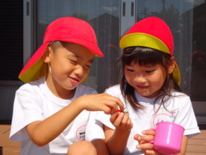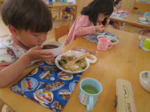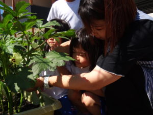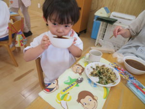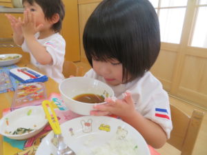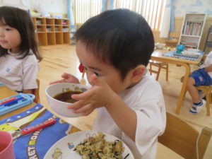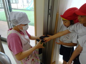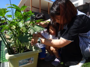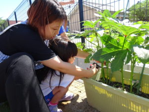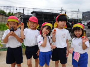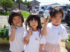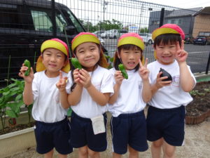 5月に苗植えをした野菜たちが大きくなり、収穫の時を迎えました。収穫した野菜は給食室に運ばれ、調理員さんにお願いすることに・・・和え物に混ぜてもらったり、お汁の具になって給食の時間にいただきました。苦手な野菜も、自分たちで育て、、収穫した喜びは大きく「あっ!おいしい!」「先生、たべれたよ!」などなど。。子ども達のうれしい声をたくさん聞くことができました。。毎日のみずやり、野菜が大きくなっていく過程を観察しながら、色々な発見がありました。実際に体験して実感していく大切さを改めて感じました。