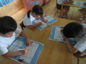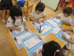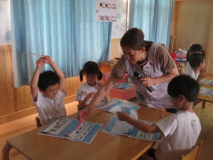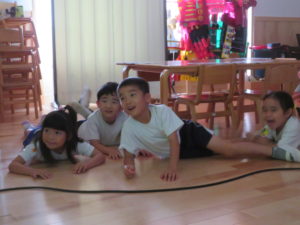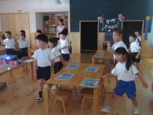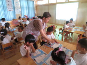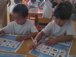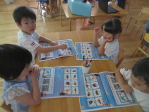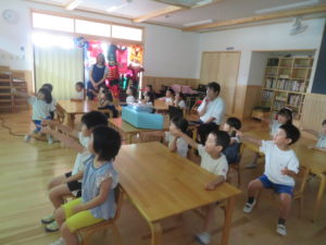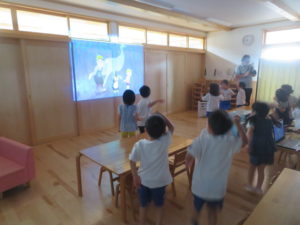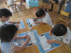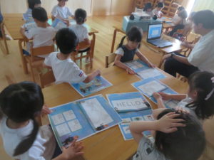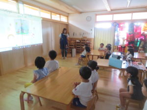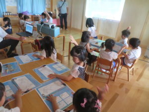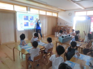 今年度も昨年度に引き続き、ゆり組・さくら組のお友だちがわかばっこEarthに参加しました。地球フレンズの教材もリニューアルし、より深く色々な国の文化に触れながら、環境について楽しく学べる内容になっています。ゆり組もさくら組も2日間にわたりオーストラリアの文化について知り、深刻な水問題について、みんなで考えることができました。今年度からはワークブックを使用しています。1ページづつ進めていきますが、ページの内容をとてもよく理解しながら参加することができました。ワークブックを全部終えると、雨が降るとたいへんだけど、自分たちの生活にとても大切だということを声に出して伝えてくれる姿がありました。また、岐阜県にはダムがないこと、お家の水道は長良川からきていることも知りました。身近な場所の環境についても知る良い機会になりました。
