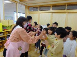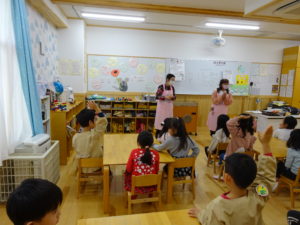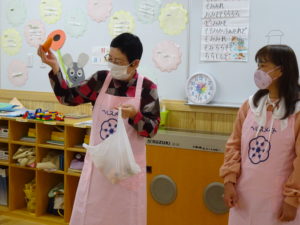令和5年11月17日(金)岐阜市食生活改善推進協議会主催の「おうちでキッズトントン」教室がありました。さくら組のお友達に、食の大切さ・調理の楽しさについてのお話を聞かせていただきました。また、ご家庭でお子様と一緒に料理をするきっかけになればと、カレーの食材セットをいただきました。子ども達は「お家でいつもやってるよ!」「ピザも作ったことあるよ」と料理についてのお話をたくさん聞かせてくれました。「今日作る!ってママにお願いしてみるー!」とやる気満々の子ども達でした。翌日には早速アンケートをご提出いただきありがとうございました。