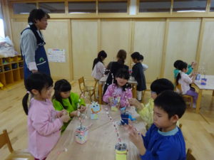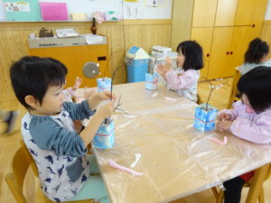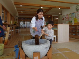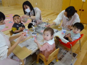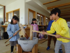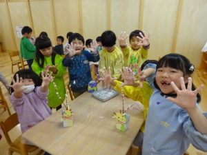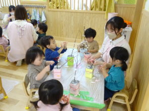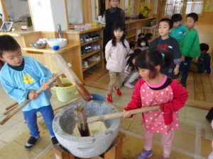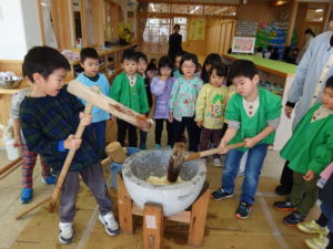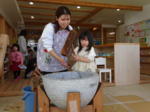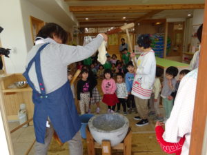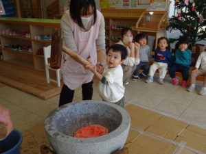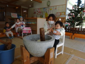 令和5年12月8日(金)保育園でお餅つきを行いました。もも組の小さいお友だちから順番に杵を持ち、ぺったんぺったんと頑張っていましたよ。食紅をいれて、花餅用にピンクのお餅も作りました。餅米からだんだんとお餅になっていく様子をみながら、「先生、お餅になってきた!」「よーし頑張るぞ~!!」と、楽しんでいましたよ。お餅つきが終わった後は、お部屋に戻り、花餅作りです。手にくっついて苦戦してる様子も見られましたが、完成するとどの子も満足そうに眺めていました。あったかいお湯にみんなで輪になって手をいれて、くっついたお餅をとるのもおしゃべりに花が咲き、楽しそうでしたよ。
