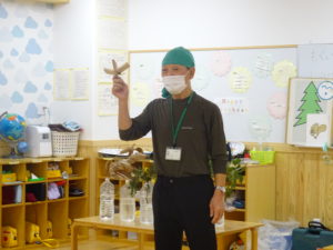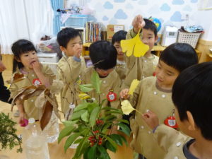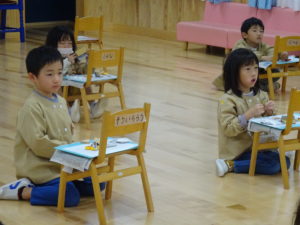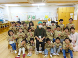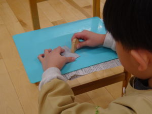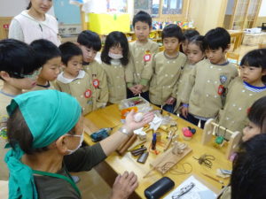 令和5年12月15日(金)さくら組さんが木育教室に参加しました。今年度も、森のおじさんこと、入江先生にお越しいただき、色々な木の紹介をしていただき、自然に触れる貴重な時間になりました。事前に、杉の木か檜で作るかをきめ、準備しました。木の香りを十分に楽しんだ後、やすりで木のツクツクをとっていきます。これが、とても根気のいる作業でしたが、みんな夢中になって取り組んでいましたよ。出来上がると、お友だちと見せ合ったり、だれのためにつくったかなどを発表しあいました。自分のため、又は家族のためにと様々でしたが、素敵なアクセサリー・お守りを完成させることができました。帰りに持ち帰るときは、お迎えに来て下さったおうちの方にプレゼントしている微笑ましい姿がありましたよ。