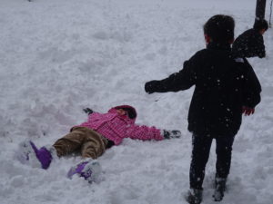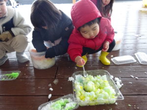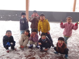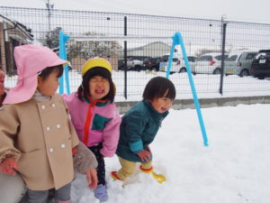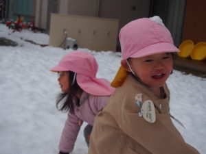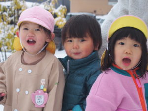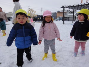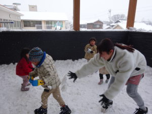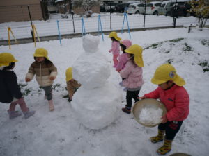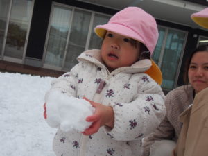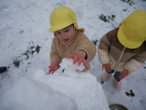 令和6年1月24日(水)は朝から一面の銀世界。登園して真っ先に外に飛び出していったのはゆり組さんでした。園庭に積もった雪を早速手に取り遊び始めました。「冷た~い」「フワフワ!」と感触を楽しむ子ども達。雪合戦や、雪だるまつくりも始まり、あっという間に時間が過ぎていきます。そして、他のクラスの子ども達も次々に外に飛び出してきました。小さいクラスのお友達は土間で雪に触れてみました。それだけでは物足りず園庭に出てみると、キュッキュッと雪を踏みしめ、音にも耳を傾け楽しんでいましたよ。2階のテラスにも雪が積もっていて、色々な場所で雪遊びを楽しむことができました。子どもは風の子!寒くてもヘッチャラですね!