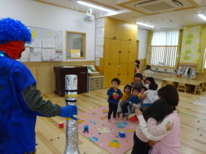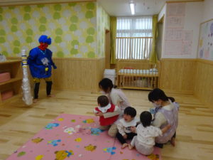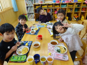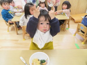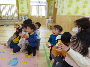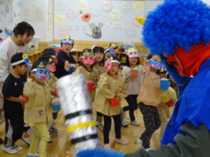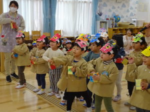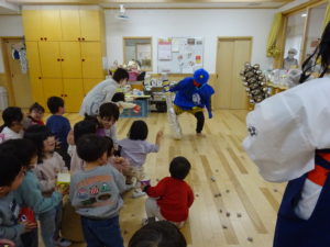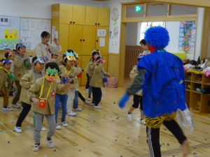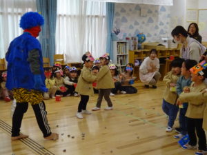 令和6年2月2日(金)保育園に鬼がやってきました。一週間前に鬼から大きな手紙が届き玄関に張り出してあったので、今日くるの?明日?とちょっぴりドキドキの子ども達でした。おおきな太鼓の音と共に鬼はまず、ひよこ組のお部屋へ。。鬼が入ってくると保育士の胸に顔をうずめ、泣き出してしまうお友だちでしたが、保育士と一緒に頑張って豆まきすることができましたよ。そして、鬼は2階の大きいクラスのお友だちのもとへ。手に升、まめを持ち豆まきの準備も万端!!・・・のはずでしたが、いざ鬼が近づくと「キャーキャー」いいながら逃げ回っていました。怖いけど、鬼の背後に近づき豆を投げるお友だちの姿も。ばら組・ゆり組・さくら組と順番に豆まきをしましたが、なかなか退散してくれません。そこへ・・救世主・お福さん登場!今年もやっぱり強かった!見事、鬼をやっつけてくれましたよ。豆まきが終わるとホッとしたのか表情が軽くなっと子ども達。心の中の鬼もやっつけれましたね。今日の給食は、鬼ご飯です。ほうれん草・チーズ・のり・ウインナーの具材をつかって、鬼の顔を楽しそうに作っていましたよ!