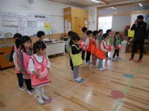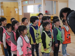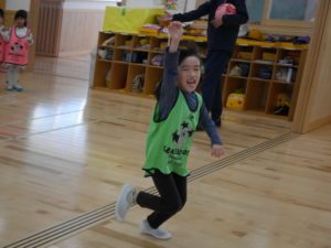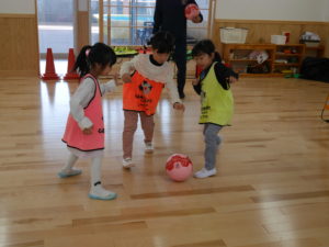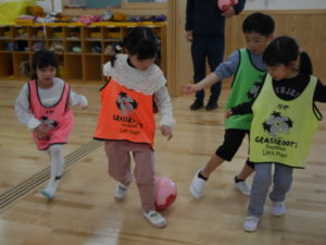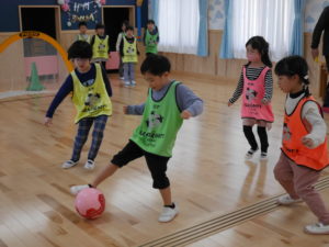 サッカー教室 2024.02.13 令和6年2月9日(金)さくら組のお友達がサッカー教室に参加しました。サッカースクールのコーチに来ていただき、基本的な動作からミニゲームまで楽しんでいたさくら組さんです。男の子と女の子の混合チームで行ったミニゲームでは、どの子も夢中になってボールを追いかけ、シュートが入ると飛び上がって喜んでいましたよ。サッカー大好きのさくら組さん、園庭にサッカーゴールを用意すると、子ども達だけでチームを作りゲームを楽しんでいました。 < >