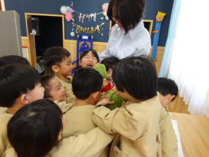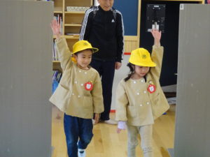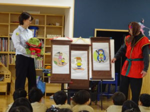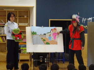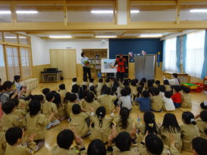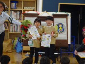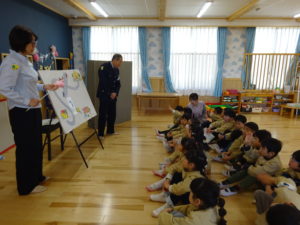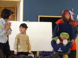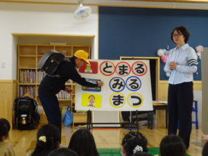 令和6年3月18日(月)ぞうさんクラブの指導員さんにお越しいただき、交通ルールについて楽しく学ぶことができました。もも2組さんから参加しました。忍者に変身した指導員さんがとても分かりやすくお話してくださり、小さいお友達も夢中になってお話を聞くことができましたよ。年長さくら組さんはさらに「みちおくん」と一緒に実際に横断歩道を歩き、正しい道路の歩き方を学びました。少し緊張していたお友達もいましたが、カエル君の応援もあり頑張りましたよ。1年生になって道路を歩くとき、ぞうさんクラブでのお約束を忘れずに車に気を付けて学校に通ってくださいね。