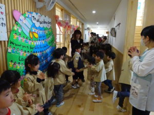令和5年度の卒園式が、3月22日(金)ホールで行われました。お家の方と一緒に登園し、胸にお花をつけてもらったり、写真撮影をして式までの時間もあっという間でした。卒園児入場からは、表情も引き締まり、年長児らしく堂々と式に参加することができましたよ。一人ひとり、卒園証書を受け取り、保護者の方や保育士たちに立派な姿を見せてくれたさくら組さんです。今年度は途中から、年中ゆり組さんが参加し、「おわかれのことば・歌」でさくら組さんを送り出してくれました。さくら組の思い出では、「ゆめわかば」「新しい明日へ」を歌いさくら組さんとの思い出が走馬灯のようにながれ、感動でいっぱいに包まれた卒園式でした。園舎では、在園児たちも最後のお見送りにかけつけてくれ、さくら組さんとタッチをしてお別れしました。若葉保育園での思い出を忘れずに元気いっぱいの1年生になってくださいね。そして、かっこいいランドセル姿で時々保育園に遊びに来てくださいね。