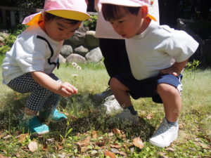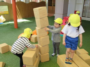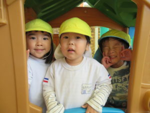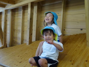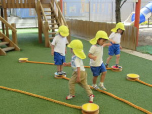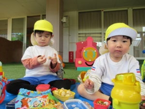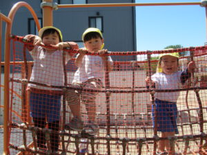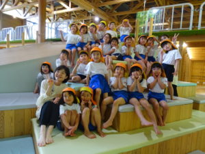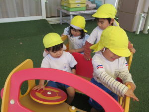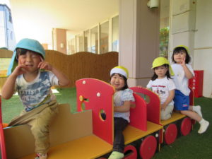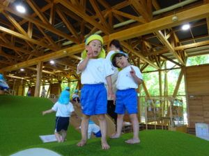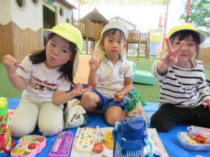 3歳・ばら組のお友だちは、幼稚園さんのバスに乗って、若葉第一幼稚園に遊びに行きました。バスが駐車場に到着すると大興奮!!園長先生に元気に手を振って出かけていきました。第一幼稚園では全天候型遊具施設があり、保育園にはない固定遊具に大喜びでみんな夢中になって遊んでいました。芝生spaceにブルーシートを敷いて、みんなで一緒にお弁当をいただきました。「せんせい、みてみて!!」と嬉しそうに保育士に見せてくれたり、お友だちと見せ合いながらおいしそうに食べていましたよ。おやつも食べ終わると、残りの時間も目一杯遊び、遠足を満喫していたばら組のお友だちでした。