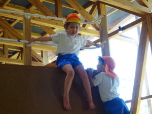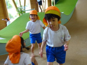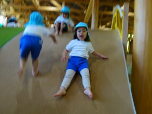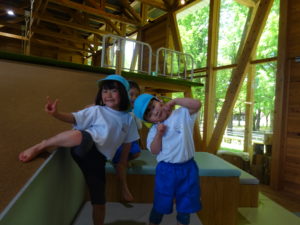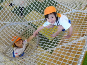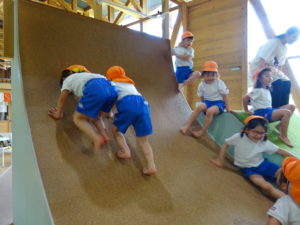 ゆり・さくら組のお友だちは、若葉第一幼稚園のバスにのって、KAKAMIGAHARA・PARKBRIDGに遊びに行きました。施設の中に入ると担任の先生と遊びのお約束をし、先生が「いってらっしゃ~い!」と声をかけると、遊びたい場所に元気に走り出すわかばっこ達でした。「せんせい、おにごっこしよう!」「せんせい、みててね!」と角度のある坂を思い切り走り上まで登ったり、ネットを上手につかみながら下から上、上から下と感心するほどのスピードで上り下りしたり、元気いっぱいでした。お弁当は、ゆり組、さくら組とわかれていただきました。いただきますまで待ちきれない様子の子ども達。「せんせい、あけてていい?」とふたをあけとっても嬉しそうにお友だちと見せ合いっこをしていましたよ。帰りのバスが到着したことを伝えると「え~、もっとあそびた~い!!」と名残惜しそうにしていましたが、施設の方にみんなでお礼を伝え園にもどりました。