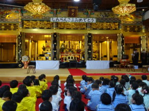令和6年5月20日(月)さくら組のお友だちが親鸞聖人の生誕をお祝いする会、降誕会に西別院まで出かけていき、参加してきました。他の地域からもたくさんの幼稚園・保育園のお友達が参加しており盛大に親鸞様のお誕生をお祝いしていました。会の途中で他園の園長先生から親鸞様がまだこの世にいらしていたら850歳になるというお話をききました。850歳という年齢は想像がつきにくいかもしれませんが長い間続いている降誕会に参加することができ、貴重な経験になりました。合掌「南無阿弥陀仏」を3回繰り返し、礼拝をしたり、「賛歌 ほとけさま」を会場の全園児で歌い、保育園で行うお参りとはまた違う雰囲気を味わうことができました。