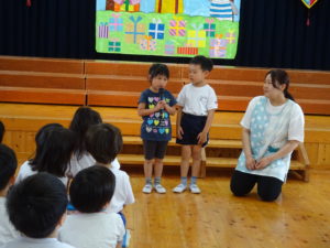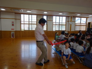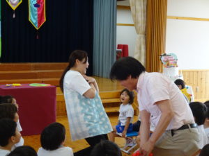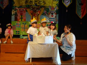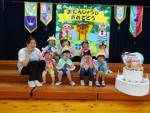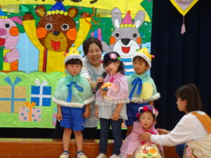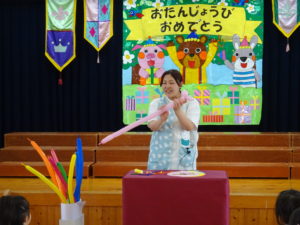 令和6年5月24日(金)ホールで5月生まれのお誕生会がありました。お祝いのお花の冠や、マントを身につけると、とても嬉しそうな誕生児でした。年長さんは、将来の夢で、「おもちゃ屋さん!」小さいお友達は「いちごとチョコレート!」と2つ教えてくれたお友達もいて、驚かされました。先生からのプレゼントアトラクションは、「バルーンアート」でした。犬・きりん・飛行機・トンボ・そしてみんなの大好きなエメピー(セキセイインコ)を次々に作って見せてくれました。みんな、夢中になって作る様子を見ていましたよ。最後には赤い風船で剣を作って、園長先生にプレゼント!園長先生が剣を振りかざすポーズをみせるとみんなお喜びでした。5月生まれのお友だち、お誕生日おめでとう!!